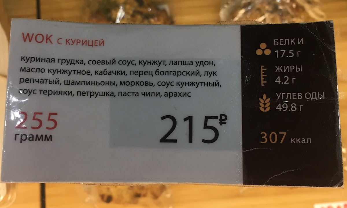 Состав: говядина, соль, розмарин, перец молотый, чеснок, масло растительное, перец болгарский, шампиньоны, кабачки, морковь, лапша гречневая, кунжут, имбирь, соевый соус, вода, соус барбекю, уксус рисовый, масло кунжутное, соус устричный, мирин, сахар, аджиномото, крахмал, арахис.